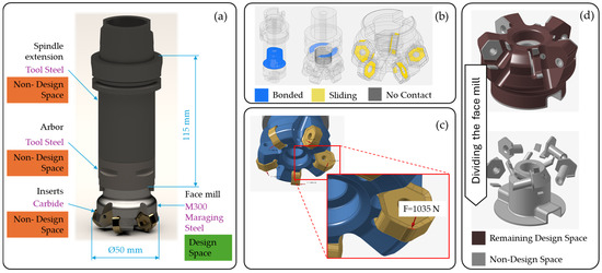 Spindle extension, arbor, and inserts were chosen as non-design areas for optimizations, indicating that they cannot undergo any material removal or weight reduction (Figure 4a). Even though the face mill body was viewed as a design area, the mating features were divided and excluded from optimizations to maintain the assembly integrity (Figure 4d).
