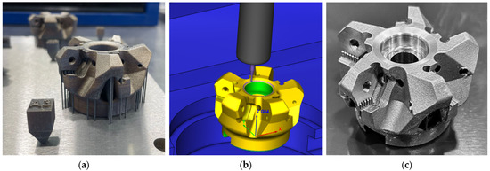 (a) Face mill and density cube and support structures following LPBF, (b) machining simulation using Vericut, (c) finished face mill.