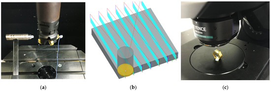 Machining tests were performed on a Mazak Variaxis I500, located at AMRC NW, using four plates of Ti6Al4V (ASTM Grade 5 titanium) alloy with dimensions of 200 × 200 × 50 mm3 [34]. A zig cutting strategy was employed to keep each parameter and climb cutting the same throughout all machining (Figure 6b); 60 m/min cutting speed (Vc), 0.113 mm feed per tooth (fz), 2 mm axial depth of cut (ap), and 30 mm radial depth of cut (ae) were considered, and toolpath generation was accomplished using Siemens NX CAM module. Tests were deliberately paused at the 30 min mark during the cutting process to assess the progress of the tool wear and finished after 1 h of cutting.