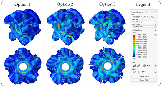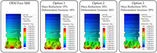 Since some of the TO gave way to an irregular and inhomogeneous mesh distribution near insert mating faces, surface reconstructions needed careful consideration. There were detached regions close to the insert mating faces in just one of the results, Option 3, which had the most ambitious mass reduction target. The Polygon Modeling module of Siemens NX 2412 and the PolyNURBS modeling module of Altair Inspire were used to overcome these problems; however, this revealed the necessity of FEA simulations on the new geometries. Figure 7 shows the results of FEA simulations of the reconstructed face mills that were optimized by aiming for minimum mass reductions of 15%, 25%, and 35%, respectively, for the three options. These optimizations also limited the deformation increase relative to the OEM face mill to less than 20%, 25%, and 30%. As can be seen in Figure 7, all optimization targets regarding the mass reduction were successfully met and none of the deformation constraints were violated.