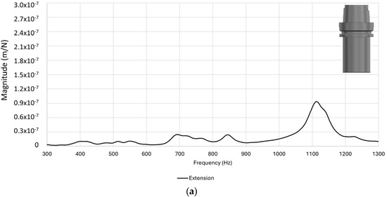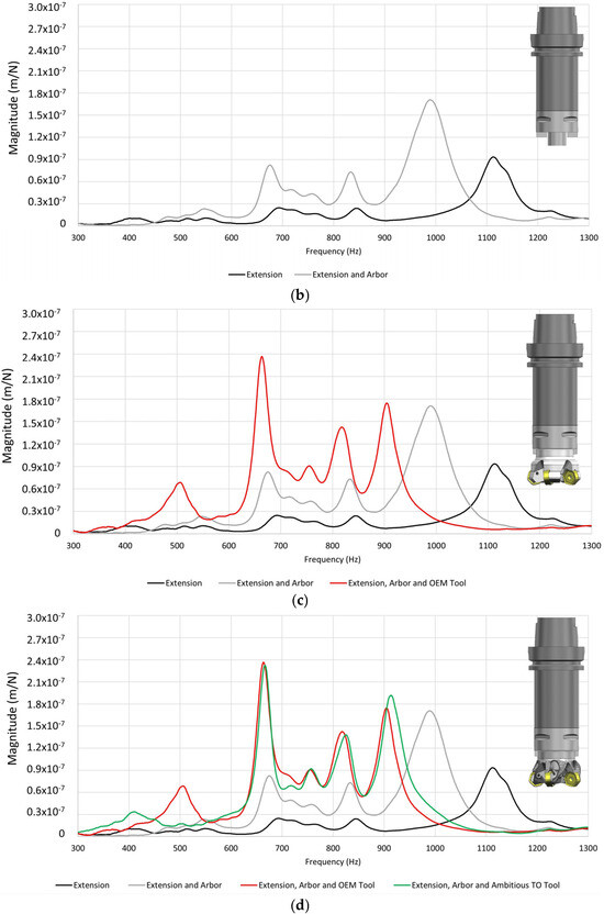 Final tap tests were carried out on the Mazak Variaxis I500 (Japan) utilizing the Productive Machines TapStarter kit (United Kingdom). This was utilized with the ICP 50,862 hammer, PCB Model 352C23 accelerometer, and the ICP Model 485B39 sensor signal conditioner, all of which were properly calibrated. Tap testing began solely with spindle extension, followed by the sequential addition of arbor, OEM face mill, and inserts (Figure 6a). This procedure was also carried out for additively manufactured face mills considering two axial directions as X and Y. The outputs were received as csv files in a columnar format, including frequency (1–10,000 Hz) and magnitude (m/N). In creating the frequency and magnitude graphs for this article, the resulting real and imaginary values were considered, and the averages of the X and Y directions are presented to provide a summary of numerous measurements. The frequency range of 300–1300 Hz was plotted to prevent any negligible values, emphasize the key window, and clearly present the benchmark within the focused range.