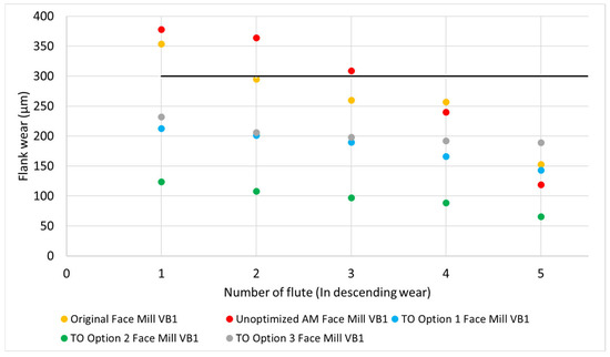 The optimal outcomes were seen with TO Option 2, which had a moderate mass reduction, whereas the least favorable results were linked to the unoptimized AM tool. Of the three optimized versions, the TO Option 3 face mill had the lowest performance. Despite having more ambitious optimization goals than the other two, which results in greater reductions in mass and vibration magnitude, this observation might be linked to micro deflections in thin insert supports during the process, causing variations in chip thickness. On the other hand, the thinner sections may be less effective than the thicker ones at transferring heat to the arbor and extension body, resulting in the reduced cooling of the face mill and inserts. However, in this study, the effect of the coolant was not taken into consideration, and it is possible that this optimized geometry might have led to some unfavorable conditions regarding the cooling. Figure 11 illustrates that the inserts from TO Option 1, TO Option 2, and TO Option 3 face mills with reduced wear showed minimal variation among themselves, and the average flank wear across various inserts stayed within a steady range. The variations in average flank wear among different inserts of the original face mill and the unoptimized AM face mill ranged from 0.15 m to 0.35 mm.