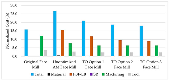 The economic viability of employing additive manufacturing technologies for producing face mills was examined once all technical evaluations were finished. Although the real cycle time computations were executed for all AM face mills taking into account PBF-LB, SR, and machining phases, an estimation was made for the conventional face mill by programming creep feed grinding of the flutes using parameters outlined in the article by Dang et al. (2022) [39]. These cycle times were subsequently multiplied by staff costs and machine charge rates. Ultimately, the costs for materials and tools were combined to determine the overall price. Since the information concerning costs is commercially confidential, the results were normalized as a percentage and are shown in Figure 12. As shown in Figure 12, the unoptimized AM face mill is the priciest tool due to its lengthy PBF-LB step, along with significant costs resulting from machining and powder material usage. Contrary to this, the original face mill, utilizing a conventional machining method that includes grinding, turning, and milling, exhibits the least production expenses. It is essential to emphasize that the material costs of the original face mill are this low and cannot be observed in the graph. Of the optimized variants, just TO Option 3 face mill can come close to the reduced expenses of original face mill, yet continues to exhibit elevated figures.