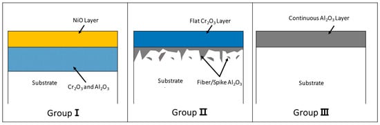 In Ni-based superalloys, which are turbine blade materials, Ni, Ti, Cr, and Al affect high-temperature oxidation/corrosion. Among them, Ni and Ti have a high oxidation rate and low oxygen affinity, which leads to poor surface adhesion. Therefore, the morphology of high-temperature oxidation layers in superalloys tends to be determined by mainly Cr and Al contents. In Figure 1, Group II and Group III are classified into high-Cr/low-Al and low-Cr/high-Al alloy compositions, respectively. In this study, 26 high-temperature oxidation layers were classified by the contents of Cr and Al composition with reference to 17 literatures.