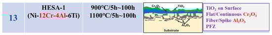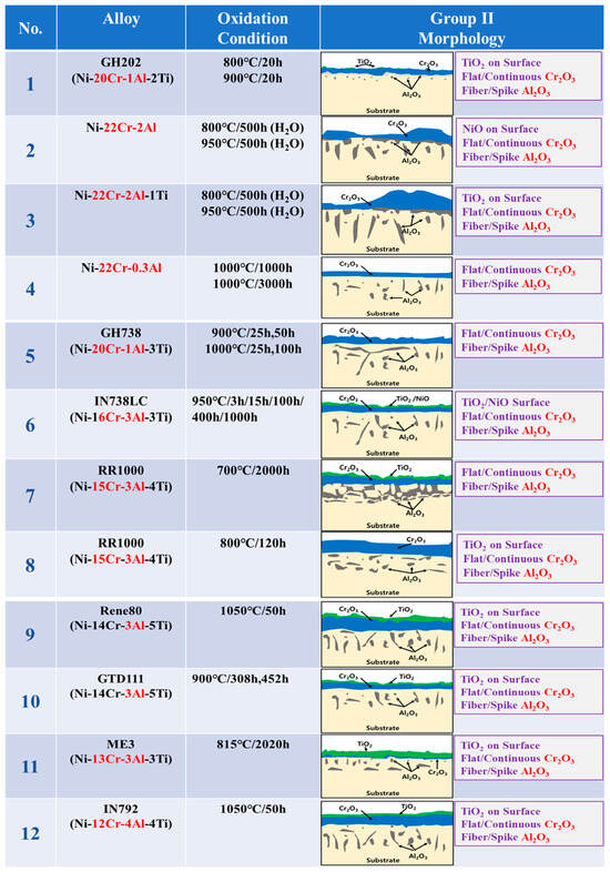 The oxidation conditions and oxide layer morphology of alloys presented as Group II (GII) in the literature surveyed are shown in Figure 2. The alloys in the GII category in the figure have high Cr (12Cr or more) and low Al (3Al or less). The surface oxide layer of the GII model in the figure has a relatively dense outermost layer of Cr2O3 and fibrous Al2O3 inside, and this oxide layer is designated as “Flat Cr2O3 + Fiber/spike Al2O3” [,,,,,,,,,].