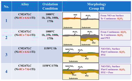 The oxidation conditions and oxide layer morphology of the high-temperature surface oxide layer of alloys proposed as group III model (GIII) investigated in the literature are shown in Figure 3. The alloys corresponding to the GIII model are low-Cr (8Cr or less) and high-Al (5Al or more) [,,,,,,]. The surface oxide layer of the GIII model is composed of relatively dense and continuously formed Al2O3 inside after the initial oxidized NiO/Cr2O3 is removed. The oxide layer is designated as “Continuous Al2O3” except for NiO/Cr2O3 which may be formed in the outermost layer. This means that most of the alloys shown in the figure consist of the continuous Al2O3 in the outer layer, in rare cases the NiO/Cr2O3 remains on the outer surface.
