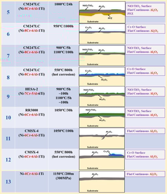 Morphologies of high-temperature surface oxide layer in various Ni-based superalloys with low-Cr/high-Al composition corresponding to the GIII model (1: [], 2: [], 3: [], 4: [], 5: [], 6: [], 7: [], 8: [], 9: [], 10: [], 11: [], 12: [], 13: []).