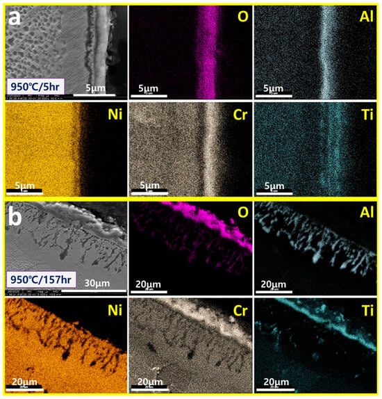 SEM/Mapping of surface oxidation layers exposed to (a) 950 °C/5 h and (b) 950 °C/157 h of IN738LC.