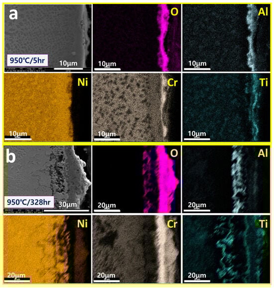 SEM/Mapping of surface oxidation layers exposed to (a) 950 °C/5 h and (b) 950 °C/328 h of IN792.