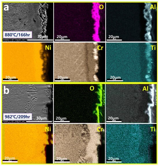SEM/mapping of surface oxidation layers exposed to (a) 880 °C/166 h and (b) 982 °C/209 h of CM247LC.