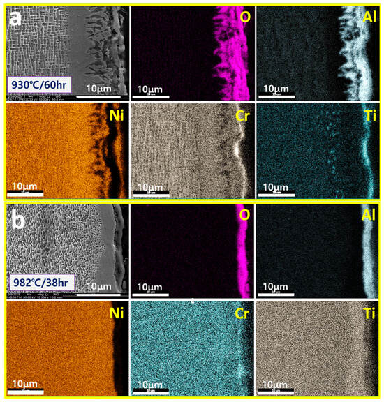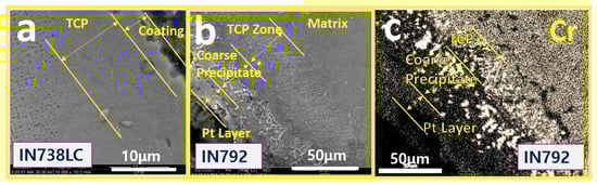 During high-temperature exposure, the IN738LC (16Cr-3Al) and IN792 (14Cr-4Al) as high Cr/low Al alloys show behaviors of Cr accumulation and depletion by inner diffusion in addition to surface oxidation. Figure 9 shows the analysis of the blade surface of each material after use in a high-temperature turbine, referencing Han’s previous paper []. The figure confirms that Cr accumulation is observed in all surface-coated blades, and that all alloys form high Cr content TCP phases.