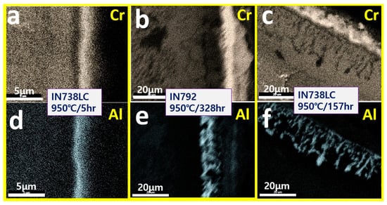 SEM/mapping of surface oxidation layers exposed to (a,d) 950 °C/5 h of IN738LC, (b,e) 950 °C/328 h of IN792, and (c,f) 950 °C/157 h of IN738LC.