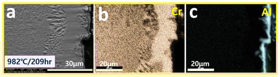 SEM/mapping of surface oxidation layers exposed to 982 °C/209 h (a) SEM, (b) Cr mapping, and (c) Al mapping.