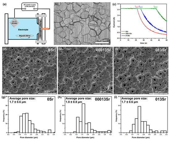 MAO treatment: (a) schematic representation of the MAO treatment set-up; (b) OM image of untreated Ti after etching; (c) current evolution during MAO treatment; secondary electron (SE) SEM images of MAO-treated (d) 0Sr, (e) 00013Sr, and (f) 013Sr surfaces; pore size distribution on MAO-treated (g) 0Sr, (h) 00013Sr, and (i) 013Sr surfaces.