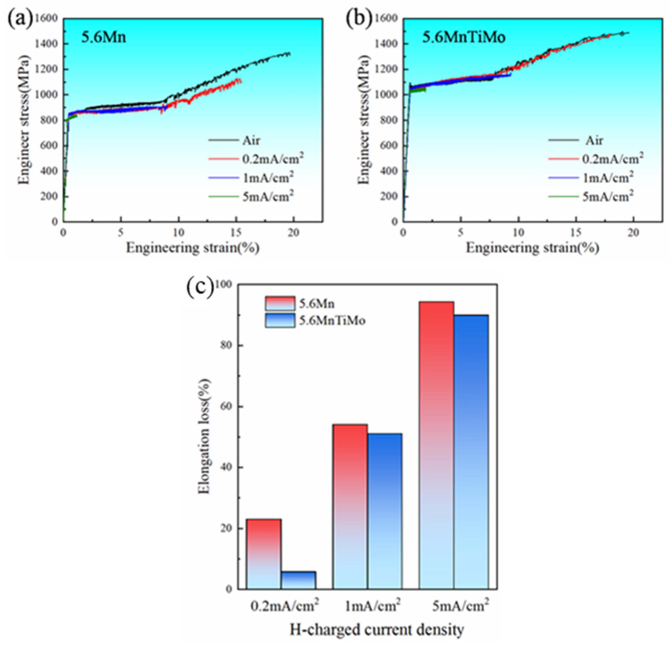 - The enhanced hydrogen embrittlement resistance of the 5.6MnTiMo alloy over the 5.6Mn alloy may be associated with the deep hydrogen traps and the improved strain compatibility at α/γ(α′) phase boundaries due to the addition of Ti and Mo.