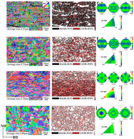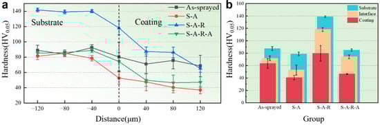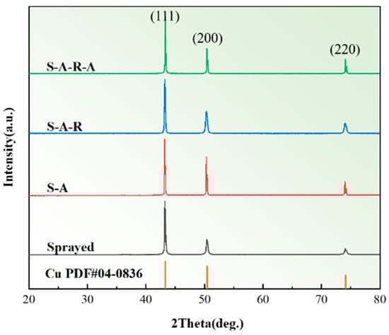- The grain sizes of the As-sprayed coating are smaller due to the rapid cooling rate during the spraying process. The grains experience the processes of growing, elongating, and growing after annealing–rolling–annealing treatment. The results of micro-hardness testing show that a uniform stress distribution appeared in the 3D microhardness cloud map of the A-R-A sample, indicating a more homogeneous hardness distribution in the coating.