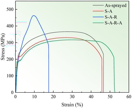 - The copper coating of the As-sprayed CSBS sample falls off directly after deep drawing due to the low interface bonding strength, as well as the poor coating properties. In contrast, the copper coating of the CSBS sample after ARA treatment does not crack and fall off, indicating that this process results in proper hardness and toughness and a better interface bonding strength, leading to a more synergistic deformation under the deep-drawing process.