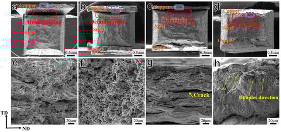 - The ARA processing significantly improves the toughness and interface bonding strength of the coating. After tensile testing, the fractured surface of the CSBS sample displays an elongated dimple morphology with the majority oriented along the TD direction. Meanwhile, the copper coating remains firmly bonded to the steel substrate and deforms cooperatively with the substrate.