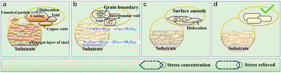 - Annealing and cold-rolling synergistic treatments effectively reduce the porosity of the As-sprayed coating and improve the density of the copper coating. The voids in the coating and interface disappear after cold-rolling and two-stage annealing treatment, as well as the oxide at the interface. Tight bonds form between the copper coating and steel substrate.