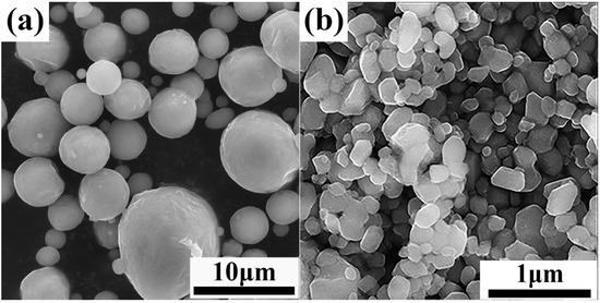 The raw materials utilized in this experiment included the following: Al12Si powder (99.7% purity, approximately 13 μm; unless otherwise specified, all components in this paper are expressed as mass fractions) and TiO2 powder (99% purity, approximately 0.5 μm), with the morphology presented in Figure 1. The Al12Si powder was purchased from Changsha TIJO Metal Materials Co., Ltd. (Changsha, China). The TiO2 powder was purchased from MACKLIN (Shanghai, China).
