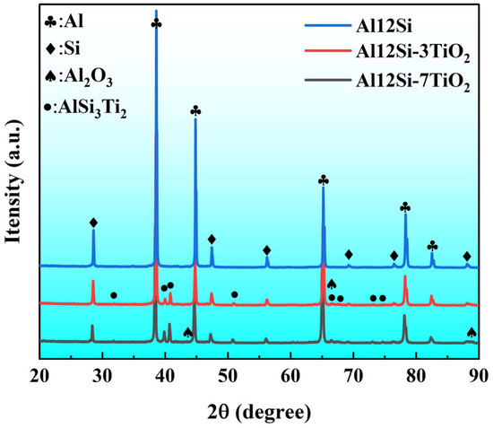 Figure 2 shows the XRD pattern of the composites with different TiO2 contents. The matrix Al12Si contains only diffraction peaks for the Al and Si phases. The diffraction peaks of Al2O3 and (Al, Si, Ti) ternary intermetallic compound phases are present in samples with 3% and 7% TiO2 addition, and the diffraction peaks of Al2O3 and (Al, Si, Ti) are enhanced with the increase of TiO2 content. A review of the literature and PDF cards shows that the intermetallic compound phase is the AlSi3Ti2 phase [22]. Meanwhile, the powder metallurgy in situ synthesized (Al, Si, Ti) intermetallic compounds exhibit a single-phase structure. The intermetallic compounds obtained through the fusion casting process in previous studies are Ti(Al1−xSix)3 phases, which result from the substitution of Al atoms with Si in the TiAl3 lattice. However, in this study, the AlSi3Ti2 phase is obtained through a powder metallurgy process and exhibits the structure of Ti(Si1−xAlx)2. Meanwhile, it can be seen that as the TiO2 content increases, the diffraction peaks of the Al phase are significantly shifted towards the low-angle direction, indicating an increase in the interplanar spacing. In contrast, the diffraction peaks of the Si phase exhibit only a slight shift towards the low-angle direction. This is because Al and Si atoms diffuse into each other, forming a solid solution. When Si atoms dissolve into the Al phase or Al atoms dissolve into the Si phase, the lattice becomes distorted. This distortion results in an increase in the unit cell parameters, which in turn causes the diffraction peaks to shift towards smaller angles.