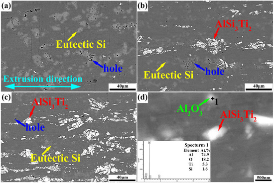 Figure 3 shows the FESEM maps and EDS results of the composites with different TiO2 contents. The white ternary intermetallic compound AlSi3Ti2 reinforcing phase and gray eutectic Si particles are distributed directionally along the extrusion direction. This result is attributed to the shear forces during extrusion. Additionally, the addition of TiO2 is observed to reduce the size of the eutectic Si particles in the composite. The smaller Si particles exert a more pronounced strengthening effect on the tensile strength of the material. As shown in Figure 3a, the Al12Si matrix contains holes, which are predominantly located around the eutectic Si particles. The number of holes in the composites decreases with increasing TiO2 content. This is because the Si particles transform into the AlSi3Ti2 intermetallic compound, which has a higher strength and is less likely to fracture or form pores during the extrusion process. Figure 3d provides a partial enlargement of Figure 3c. When analyzing the EDS results at point 1, it is evident that, although a small amount of titanium (Ti) and silicon (Si) elements are present, the white nanophase can still be identified as Al2O3 particles. The formation of Al2O3 relies on the in situ reaction between Al and TiO2. The presence of Ti is attributed to the incomplete reaction during the in situ process, resulting in residual Ti. Additionally, it is observable that the formed AlSi3Ti2 ternary intermetallic compound ranges from submicron to micron scale. However, the larger-sized micrometer AlSi3Ti2 phases tend to aggregate within the composites, which is detrimental to the enhancement of the material’s properties.