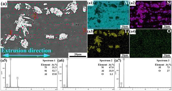 As shown in Figure 4, the FESEM and EDS images of the Al12Si–3TiO2 composites demonstrate a homogeneous distribution of the Si phase. The silicon (Si) elements are also enriched in regions where titanium (Ti) elements are enriched. The formation of the ternary intermetallic compound phase is attributed to the evolution of the Si phase. Figure 4(a5–a7) shows the EDS analysis of points 1~3 in Figure 4a. Point 1 demonstrates that the atomic ratio of Al:Si:Ti of the generated intermetallic compound phase is approximately 1:3:2, which is consistent with the XRD analysis in Figure 2. Point 2 identifies the grey phase as the eutectic Si phase, and point 3, which contains only Al and O elements, is the Al2O3 phase. When viewed in conjunction with Figure 2, this further supports the occurrence of the reaction detailed in the following Equation (1) at 650 °C: