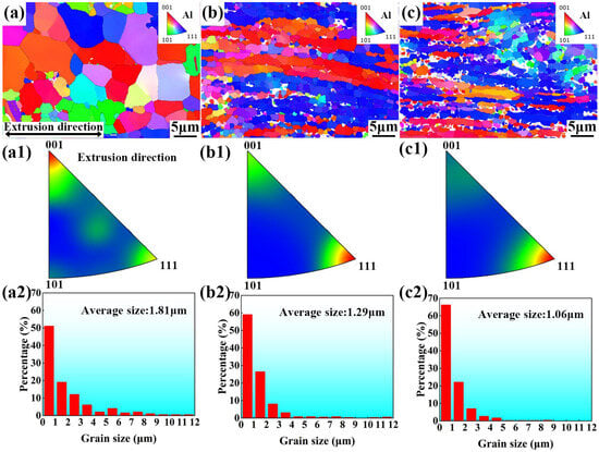 Figure 5 presents the EBSD images of the composites with varying TiO2 additions, where different colors indicate different orientations of the aluminum (Al) grains. It is evident that the α-Al grains in the TiO2-added composites are elongated along the extrusion direction. In contrast, the fine grains in the Al12Si matrix samples also exhibit elongation along the extrusion direction, whereas the coarser grains do not display this phenomenon. Meanwhile, it can be seen from the inverse poles figures in Figure 5(a1–c1) that the addition of TiO2 changes the composite texture from <001>∥ED to <111>∥ED texture, while the TiO2 content has no effect on the texture orientation. The slip systems of Al are <110>{111}, where <111> is the hard deformation direction with a low Schmid factor. In addition, the ɑ-Al grain size was measured (Figure 5(a2,b2,c2)), and the grain size of Al12Si–7TiO2 composites was a minimum of 1.06 μm. This indicates that the addition of TiO2 reduces the grain size of the Al12Si matrix, with a more pronounced refining effect observed as the TiO2 content increases. Additionally, it is well established that finer grains provide a superior strengthening effect according to the Hall–Petch principle [23].