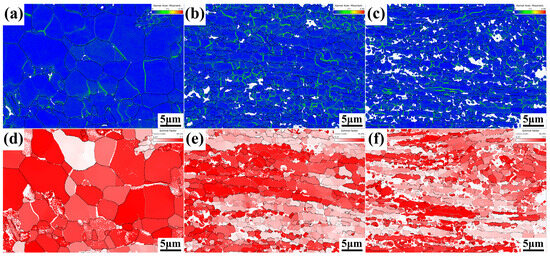 Figure 6 shows the kernel average misorientation distribution map (KAM) and the Schmidt factor distribution map (SF) of Al12Si, Al12Si–3TiO2, and Al12Si–7TiO2, from which it can be seen that the high-density dislocation areas (the green part in the local orientation difference distribution map) are concentrated at the grain boundaries and intragranular. However, in the Al12Si matrix, high-density dislocation regions are primarily located at the grain boundaries. This suggests that the phases generated by the reaction with TiO2 impede the deformation of the aluminum grains during hot extrusion, leading to a higher density of dislocations within the grains. It is conducive to the enhancement of material strength. The deep red region in the Schmidt factor distribution map (SF) of the composites in Figure 6d–f is the high slip region. With the rise of TiO2 content, the deep red region decreases, and the plastic deformation ability of the material is weakened. It is consistent with the results of tensile stress-strain diagram response in Figure 8b.