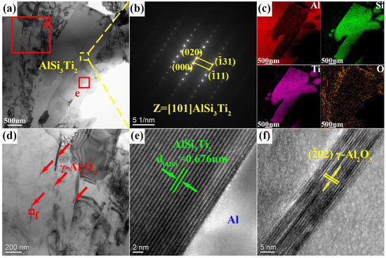 TEM images and corresponding EDS maps of Al12Si-7TiO2 composites: (a) TEM image of embedded Al2O3 and AlSi3Ti2 phases, (b) electron diffraction pattern of AlSi3Ti2, (c) corresponding EDS results in (a), (d) localized enlargement in (a), (e) enlarged view of the interface between Al and AlSi3Ti2 in (a), and (f) HRTEM image of γ-Al2O3 in (d).
