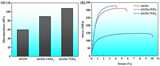 (1) The Al–12Si–7TiO2 composite exhibits a maximum tensile strength of 330 MPa and a maximum microhardness of 107 HV. The in situ-formed intracrystalline nano-γ-Al2O3 particles and micro-AlSi3Ti2 precipitates enable effective synergistic load transfer, thereby enhancing the mechanical properties of the composite material.