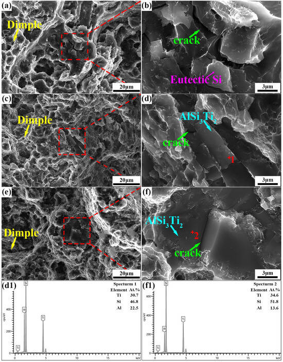 Fracture organization of Al12Si (a,b), Al12Si–3TiO2 (c,d) and Al12Si–7TiO2 (e,f) composites after tensile testing. (d1) and (f1) are the EDS results of the corresponding (d) and (f), respectively.