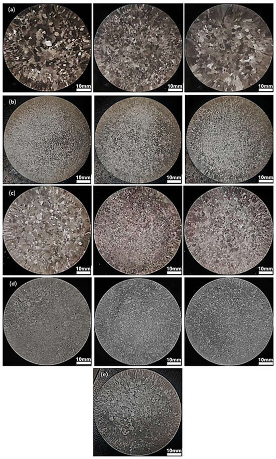 Macroscopic morphology of Al-7Si alloy after adding 2 wt% of various intermediate alloys at 10, 30 and 60 min before casting: (a) added Al-5Er intermediate alloy; (b) added Al-B intermediate alloy; (c) added Al-5Er-B intermediate alloy; (d) mixed addition of Al-5Er and Al-B intermediate alloys; (e) Al-7Si alloy.