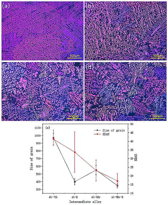 Polarised microstructure of Al-7Si alloy and its grain size statistics after the addition of various intermediate alloys 30 min before casting: (a) Al-7Si alloy; (b) Al-7Si-0.1Er alloy; (c) Al-7Si-0.02B alloy; (d) Al-7Si-0.1Er-0.02B alloy; (e) grain and SDAS size statistics of Al-Si alloys after the addition of various intermediate alloys.