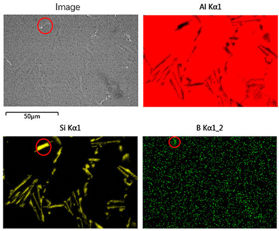 Figure 4 shows the SEM image and its correspondent mapping of the Al-7Si-0.02B alloy as-cast microstructure. It can be seen that after the addition of B to the Al-7Si alloy, a large amount of long-bar Si still exists inside the alloy, and a few AlB2 phases precipitate inside the grains. The AlB2 phase can be used as a heterogeneous nucleation site for the eutectic Si, but this role is not obvious due to its low number density (red circle). This is the reason why the secondary dendrite arm spacing (SDAS) of the alloy remains large after the addition of the Al-B intermediate alloy in Figure 2d.