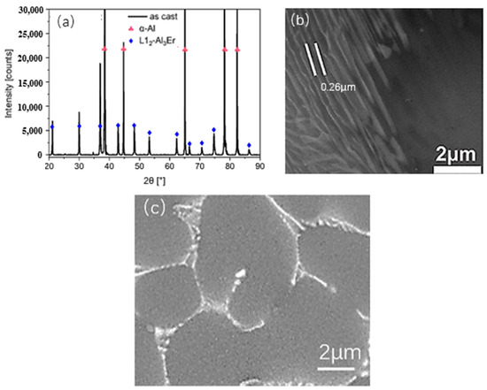Er, as a rare-earth element, can purify the aluminium melt and form a co-lattice Al3Er phase with Al [31,33]. The XRD and SEM organisation of the Al-5Er intermediate alloy is shown in Figure 5. It can be seen from the XRD peaks that there are more Al3Er phases inside the alloy. In addition, there is a eutectic microstructure in the intermediate alloy as shown in Figure 5c, and the Al3Er phases are laminar structures with a spacing of 0.26 μm. These laminar Al3Er phases are primary phases, which will melt and re-precipitate during the Al-7Si melting process.