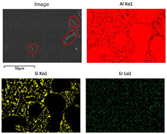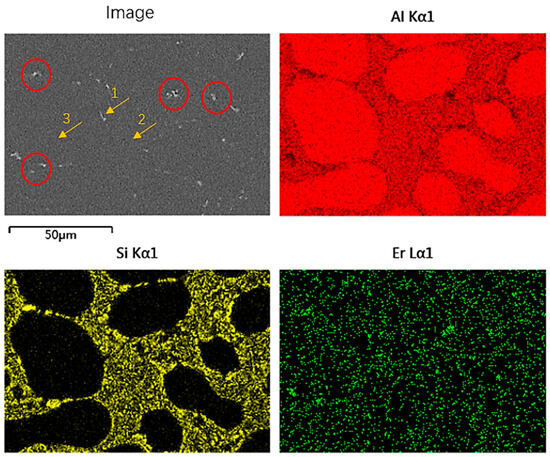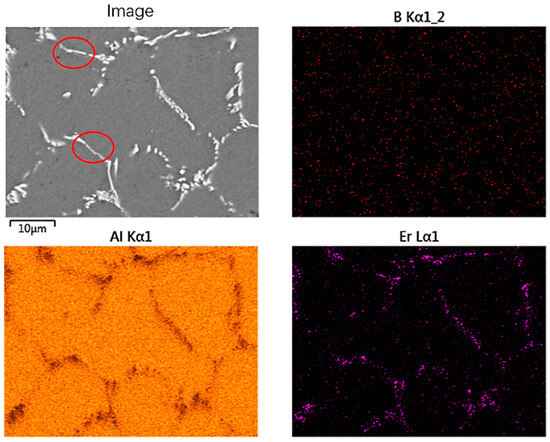 Figure 7 shows the observation of a SEM microstructure of the Al-5Er-B intermediate alloy. Compared to Figure 5c, the primary phase inside the intermediate alloy is finer and more discontinuous, and the lamellar features of the Al3Er phase are weakened. By mapping the alloy, it is found that the segregation of Er elements inside the alloy shows discontinuous distribution with ellipsoidal morphology for the Al3Er phase. The B element is not efficiently recognised due to its too light atomic mass. However, by comparing the SEM images and the distribution of Er elements, it can be found that there is a continuous flake distribution (red circle) of B elements, which is the AlB2 phase. Therefore, it is proved that the primary phases inside the Al-5Er-1B intermediate alloy are the Al3Er phase and the AlB2 phase, which are synergistically precipitated.
