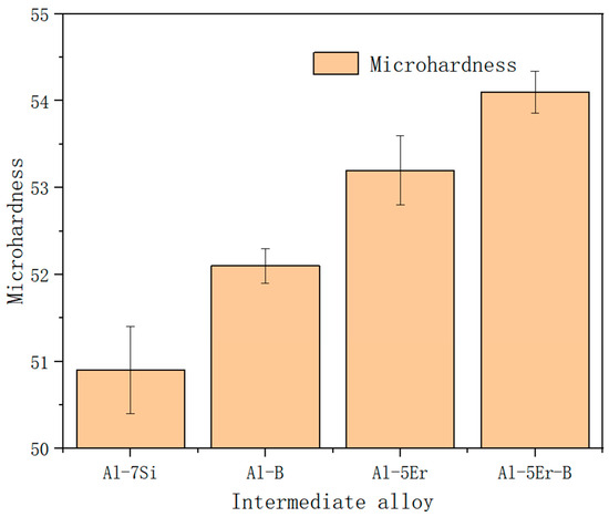 Figure 9 shows the evolution of the hardness of the Al-7Si alloy after the addition of various intermediate alloys. It can be seen that the addition of Er or B can enhance the hardness of the alloy, which occurs mainly due to the generation of Al3Er phase and AlB2 phase inside the alloy. The co-addition of Er and B further enhances the hardness of the alloy, which verifies the synergistic effect of Er and B.