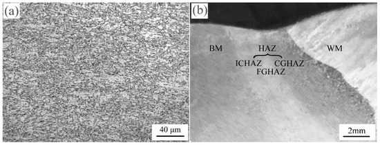(a) The microstructure of the X80 welded pipe base material and (b) the macrostructure of the zone near the welded joints.