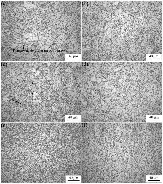 X80 welded pipe HAZ of each subregion of the metallographic structure: the real HAZ (a) CGHAZ, (c) FGHAZ, and (e) ICHAZ; thermal simulation of the HAZ, (b) CGHAZ, (d) FGHAZ, and (f) ICHAZ.