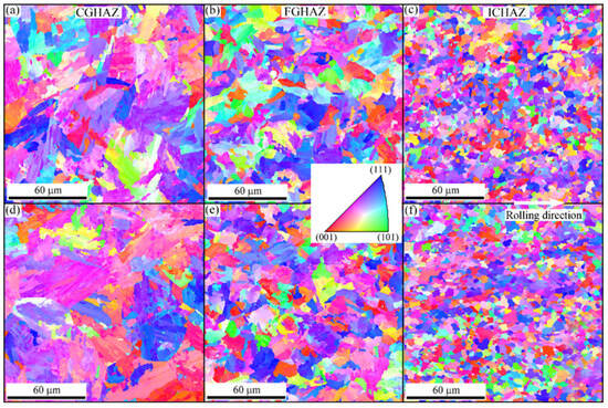 EBSD analysis results of each subregion of the HAZ of the X80 welded pipe: (a) the CGHAZ, (b) FGHAZ, and (c) ICHAZ of the real HAZ and the (d) CGHAZ, (e) FGHAZ, and (f) ICHAZ of the HAZ of the thermal simulation.