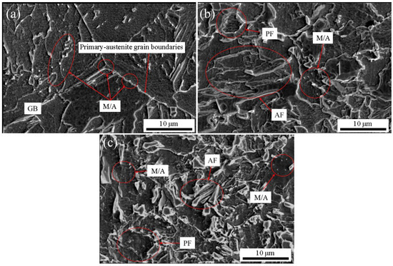 SEM structure of X80 welded pipe thermal simulation in the HAZ in each subregion: (a) CGHAZ; (b) FGHAZ; (c) ICHAZ.