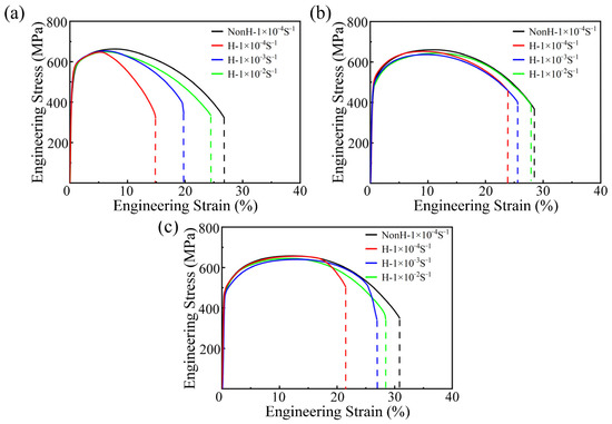 As can be seen from Table 2, the total elongation of each subregion shows a decreasing trend with a decreasing strain rate. At a strain rate of 1 × 10−4 s−1, the total elongation of specimens in each subregion affected by hydrogen is the lowest. Among them, the total elongation of the specimens in the CGHAZ decreased most seriously, and its total elongation decreased to 14.8%. Meanwhile, the total elongation in the FGHAZ decreased to 23.9%, and the total elongation in the ICHAZ decreased to 21.5%. The total elongation of the specimens affected by hydrogen in each subregion increased at a high strain rate of 1 × 10−2 s−1, but it was still lower than that of the non-hydrogen charging specimens. Compared with the elongation of the non-hydrogen charging specimens, the elongation of the CGHAZ decreased to 24.5%, while the elongation of the FGHAZ decreased by only 0.1%, and the elongation of the ICHAZ decreased to 27.9%. It shows that at higher strain rates, the effect of hydrogen on the FGHAZ is small, while the elongation of the CGHAZ and the ICHAZ still has a greater degree of influence.