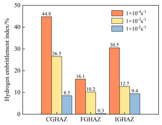 Figure 7 shows the histogram of the hydrogen embrittlement sensitivity index under different strain rate conditions in each subregion. It can be seen that all three subregions have the highest hydrogen embrittlement sensitivity at a strain rate of 1 × 10−4 s−1. The highest value of 44.8% is found in the CGHAZ, and the lowest value of 16.1% is found in the ICHAZ. With the increase in strain rate, the hydrogen embrittlement sensitivity index of the CGHAZ decreased to 8.5%; the ICHAZ still had 9.4%, and the hydrogen embrittlement sensitivity index of the FGHAZ decreased to 0.3% when the strain rate became 1 × 10−2 s−1. The results show that the strain rate has a great influence on the degree of plastic damage in the HAZ of the X80 welded pipe, especially in the CGHAZ, where the hydrogen embrittlement sensitivity index of the material is reduced by 36.3% when the strain rate is reduced from 1 × 10−2 s−1 to 1 × 10−4 s−1. It can also be seen that the hydrogen embrittlement sensitivity index is the largest in the CGHAZ, followed by the ICHAZ, and the smallest in the FGHAZ at the slower strain rate. However, the hydrogen embrittlement sensitivity index of the ICHAZ becomes the largest when the strain rate is elevated to 1 × 10−2 s−1, and therefore attention needs to be paid to the hydrogen damage behavior of the ICHAZ.