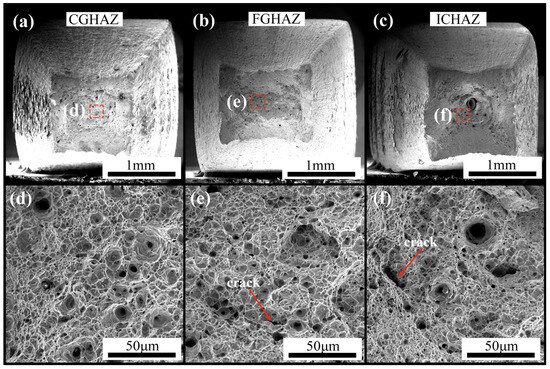 Tensile fractography of various sub-HAZs of the X80 welded pipe without hydrogen charging: macroscopic morphology of the (a) CGHAZ, (b) FGHAZ, and (c) ICHAZ; local magnification of the (d) CGHAZ, (e) FGHAZ, and (f) ICHAZ.