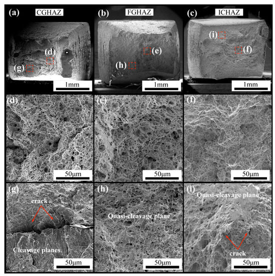 Tensile fractography of X80 welded pipe HAZ subregions after hydrogen charging: macroscopic morphology of the (a) CGHAZ, (b) FGHAZ, and (c) ICHAZ; local magnification of fracture center of the (d) CGHAZ, (e) FGHAZ, and (f) ICHAZ; local magnification of the fracture edge of the (g) CGHAZ, (h) FGHAZ, and (i) ICHAZ.