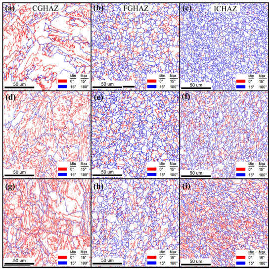 The grain boundary distribution in the HAZ of the X80 welded pipe: CGHAZ: (a) undeformed, (d) deformed by 2.5% without hydrogen charging, and (g) deformed by 2.5% after hydrogen charging; FGHAZ: (b) undeformed, (e) deformed by 2.5% without hydrogen charging, and (h) deformed by 2.5% after hydrogen charging; and the ICHAZ: (c) undeformed, (f) deformed by 2.5% without hydrogen charging, and (i) deformed by 2.5% after hydrogen charging.