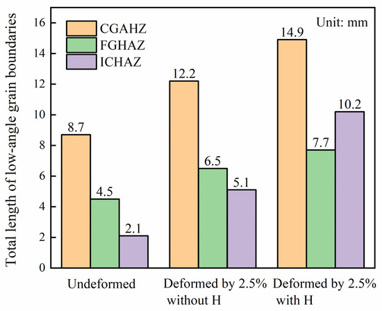 The total length of low-angle grain boundaries in various sub-HAZs of the X80 welded pipe.