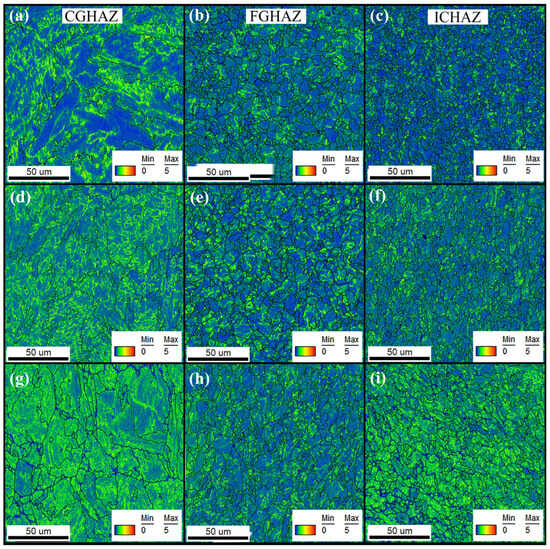The microstrain distribution in the HAZ of the X80 welded pipe: CGHAZ: (a) undeformed, (d) deformed by 2.5% without hydrogen charging, and (g) deformed by 2.5% after hydrogen charging; FGHAZ: (b) undeformed, (e) deformed by 2.5% without hydrogen charging, and (h) deformed by 2.5% after hydrogen charging; and the ICHAZ: (c) undeformed, (f) deformed by 2.5% without hydrogen charging, and (i) deformed by 2.5% after hydrogen charging.