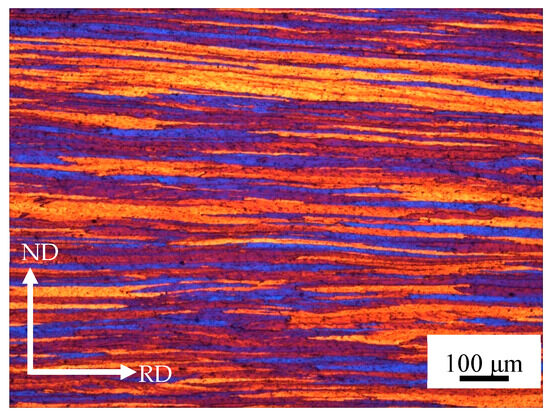 This investigation utilized 1060 aluminum alloy sheets with a thickness of 2.2 mm, and the chemical compositions of the Al alloys is shown in Table 1 (Xingyu Co., Ltd., Beijing, China). The grains in the hot-rolled sheets were elongated along the original rolling direction, as shown in Figure 1. The hot-rolled sheet was characterized by a typical β fiber rolling texture. While performing ARB on aluminum alloys, redundant shear strain was generated in the surface layer of the aluminum alloys owing to high friction between the rough rolls and sheet surface, resulting in the development of a pronounced shear texture. To explore the evolution of the rotated β fiber during shear deformation, the ARB processes were performed along the original TD without lubrication.